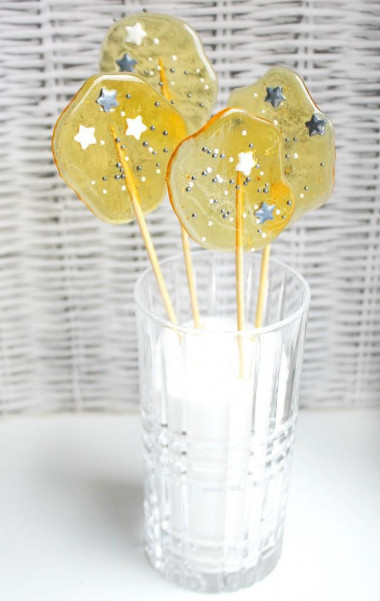 Также приготовьте деревянные палочки, на которые будете насаживать леденцы. Для этой цели хорошо подойдут деревянные шпажки. Если они слишком длинные, разрежьте их пополам. Подготовьте бумагу, на которой будет сушиться карамель. Лучше всего подойдет тефлоновый коврик. Если его нет, возьмите обычный пергамент и хорошо смажьте его растительным малом без запаха. Я еще использовала кондитерскую посыпку для украшения.