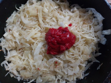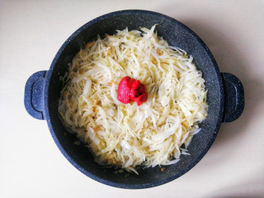 Когда капуста станет мягкой, добавьте томатную пасту. Перемешайте, снова накройте крышкой и оставьте тушиться на 5 минут.