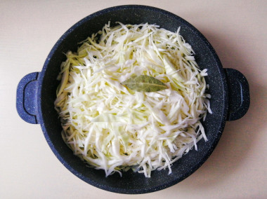 Выложите в сковороду половину капусты, посолите ее, перемешайте. Выложите оставшуюся порцию, в нее также добавьте соль, перец, лавровый лист. Перемешайте.