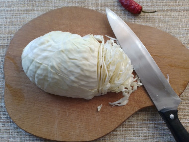 У капусты уберите верхние листья, вырежьте кочерыжку, ополосните под прохладной водой. Нашинкуйте капусту тонкой соломкой.
