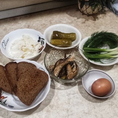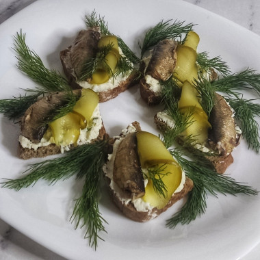 Очень понравилось сочетание творожного сыра, шпрот,огурчиков и хрустящего черного хлеба.