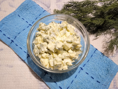 Заправьте салат майонезом и перемешайте. Перемешивайте салат аккуратно, чтобы мягкие ингредиенты сильно не повредить. Поставьте его в холодильник и дайте немного охладиться. Перед подачей переложить салат в салатник и подавайте к столу. Приятного аппетита!