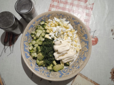Отварные яйца нарежьте крупными кубиками, чтобы в салате они не размазывались по другим ингредиентам. Добавьте нарезанные яйца к салату.