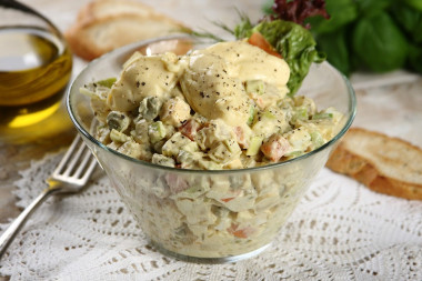 Также в качестве заправки можно использовать не только майонез, но и сметану или натуральный йогурт. Их можно взять по отдельности либо смешать с майонезом в любой пропорции на свой вкус - это снизит калорийность блюда.