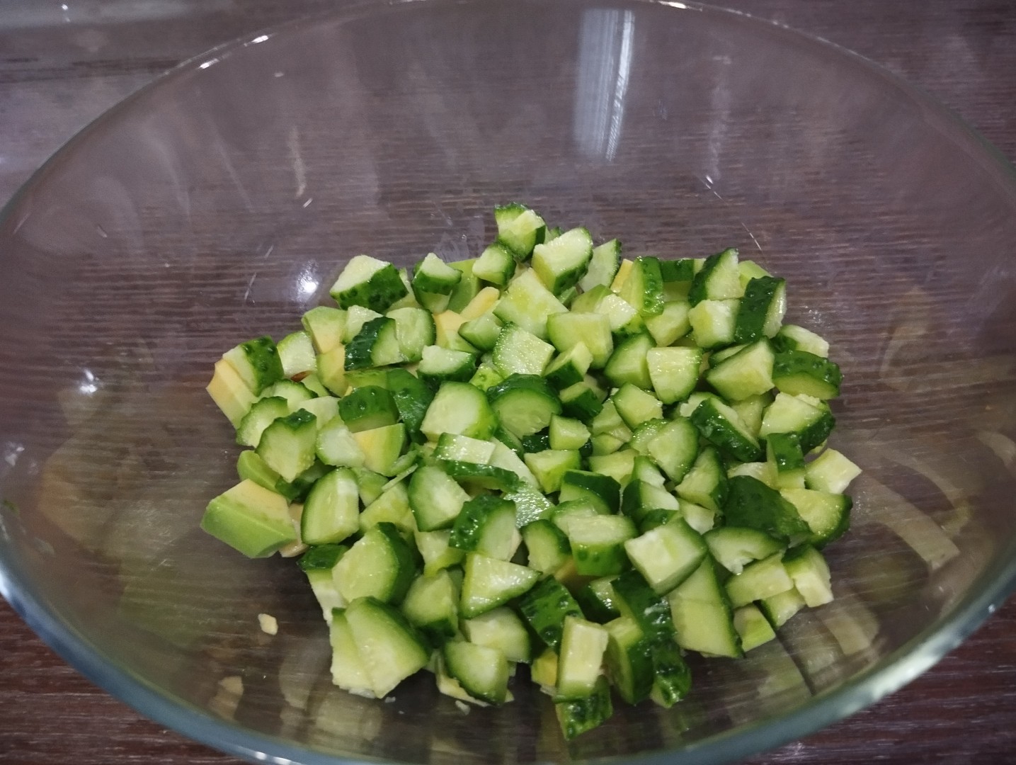Огурец помойте и, так же, нарежьте кубиками. Добавьте нарезанный огурец в чашу к авокадо.