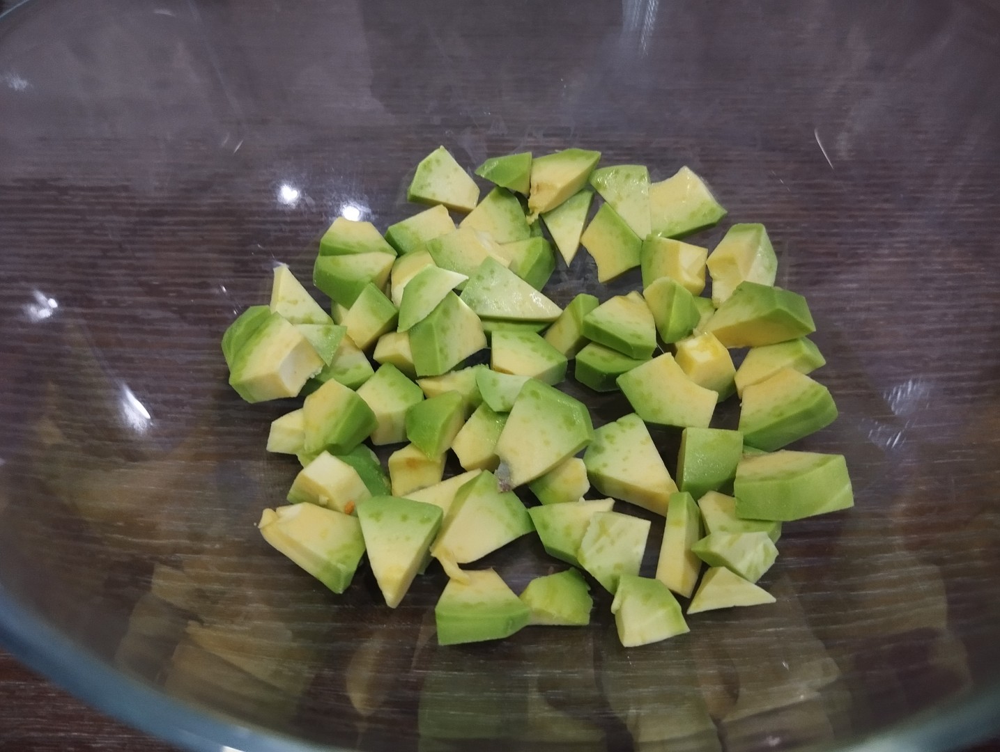 Саму мякоть авокадо нарежьте кубиками и выложите в подготовленную чашу для салата.