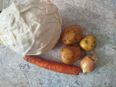 Взяли необходимые продукты. Капусту нашинковала,положила в отдельную миску. Нарезала мелко репчатый лук и натерла морковь,положила их на сковороду с маслом и немного обжарила,добавила капусту,перемешала ,закрыла крышкой,оставила тушится на среднем огне. В это время почистила картошку и нарезала ее кубиками. Добавила картошку к капусте,добавила соль и перец,ещё добавила немного воды,чтобы овощи тушились. Когда картошка стала мягкой,добавила томатную пасту,перемешала и потушила ещё 5 мин.