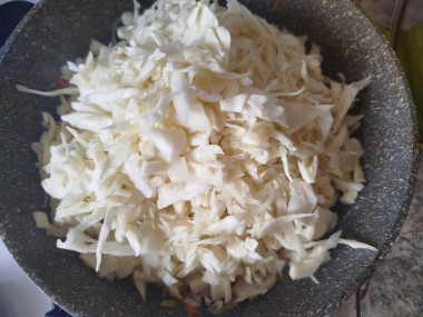 Белокочанную капусту очистите от верхних грязных листьев. Тонко нашинкуйте и добавьте на сковородку к обжаренным овощам, аккуратно все перемешайте. Накройте сковородку крышкой и тушите на небольшом огне около 20 минут.