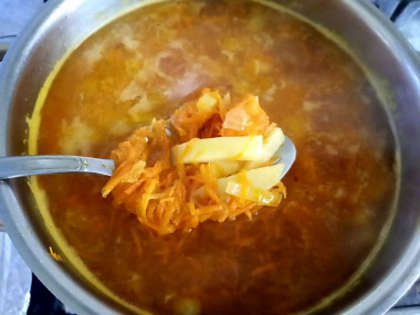 Через 15 минут добавьте овощную зажарку и проварите суп с ней еще 5 минут. Затем добавьте плавленый сыр и хорошо перемешайте суп до его полного растворения. Варите еще 5 минут, до готовности овощей. Тем временем разделайте рыбу на волокна и закиньте в кастрюлю. Вот теперь попробуйте суп на соль и досолите по необходимости. Добавьте специи по вкусу. Суп готов, подавайте его к столу. Приятного аппетита!