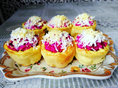 "Тесто" после выпечки поднялось, донышки почти сравнявшись с краями корзиночек. Как только корзиночки остыли, осторожно вдавила донышки вниз. Заполняла и украшала их по-своему. Сначала выложила на дно мелко нарезанную селедку, поверх неё начинку из свеклы, яйца, лука и майонеза. Сверху присыпала натёртым на тёрке вареным яйцом.
