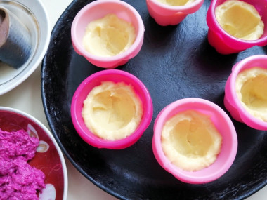 Из остывшего пюре делаем корзиночки. Для этого нам понадобятся силиконовые формочки для кексов или маффинов, если формочки не силиконовые, то их предварительно смазываем растительным маслом.