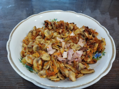 Остывшие обжаренные грибы с овощами добавьте в салатник к курице. Для более привлекательной подачи (например, для гостей) можно оставить целыми половинки грибов и использовать их для украшения салата.