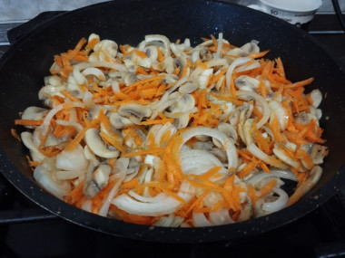 Лук и морковь помойте и очистите. Морковь натрите на крупной терке, лук порежьте. Сковороду разогрейте, налейте на нее растительное масло. В зависимости от того, какие грибы буду использоваться, меняется очередность обжаривания ингредиентов. Если грибы свежие, то сначала помойте, порежьте и обжарьте их. Затем добавьте овощи и жарьте до готовности. Если грибы консервированные, то сначала обжарьте овощи, а уже затем добавьте грибы.