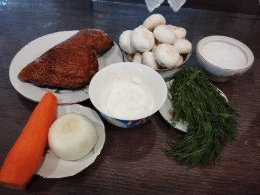 Как сделать салат с копченой куриной грудкой и шампиньонами? Подготовьте продукты. Салат готовится с копченой грудкой, но можно использовать и любую другую часть курицы. Вместо консервированных шампиньонов подойдут и свежие. Лук и морковь возьмите среднего размера. Для заправки салата берется майонез, его можно заменить смесью сметаны и горчицы.