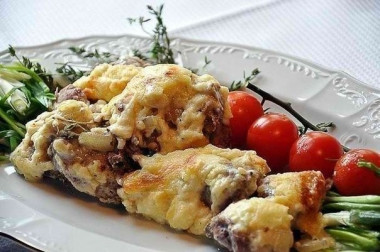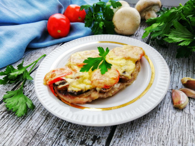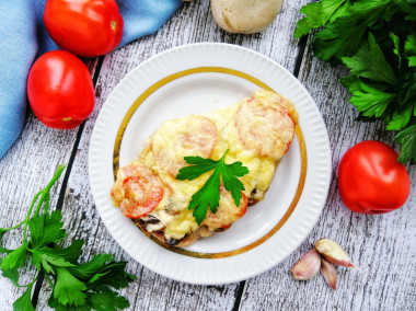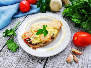 Смазала шампиньоны майонезом, сверху добавила кружочки помидор (мне хватило одной помидорки) и поставила форму в духовку на 30 минут. Запекала при температуре 220°. После этого посыпала мясо натертым сыром и отправила в духовку еще на 15 минут. Сырная корочка вышла чудесная - румяная и нежная по консистенции. Мясо отлично пропеклось, получилось очень сочное и вкусное! Особенно хорошо это чувствовалось, когда на вилке оказывались все слои, такие аппетитные! Всем советую попробовать!