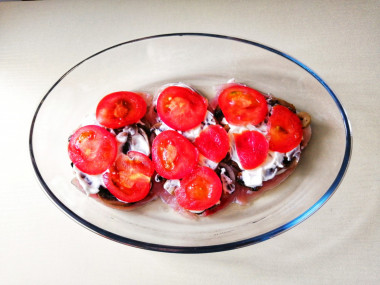 Смажьте грибы небольшим количеством майонеза и разложите на них нарезанные помидоры. Вместо майонеза можно использовать сметану или аджику. Немного подсолите помидоры. Отправьте противень с мясом в духовку, разогретую до 180 С, примерно на 30 минут. Точное время зависит от вашей духовки. Узнать об особенностях работы духовок можно, прочитав отдельную статью, ссылка в конце рецепта.