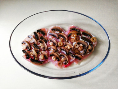 Грибы можно использовать любые - шампиньоны или лесные. Я использую отварные и замороженные. Но перед использованием их необходимо разморозить. Распределите равномерно грибы по кусочкам мяса. Если вы не любите грибы, то можно исключить их состава. Вкус, конечно, станет менее насыщенный, но тоже будет очень вкусно.
