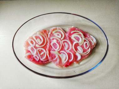 Противень для запекания застелите пергаментом. Правильно выбрать пергаментную бумагу вы сможете, прочитав отдельную статью про особенности пергамента, ссылка есть в конце рецепта. Выложите отбитое мясо на противень. Лук очистите от шелухи, помойте и нарежьте. Разложите нарезанный лук по мясу. Мясо присыпьте немного солью и специями.