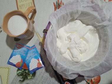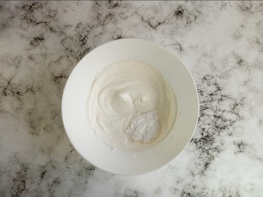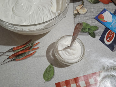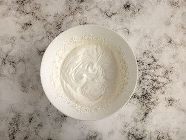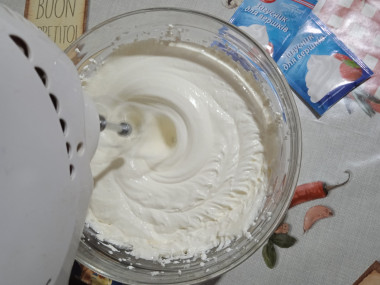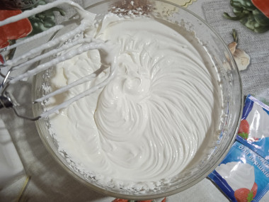 Перед работой миску и венчики охладила в морозилке. У меня сметана была 25 %, но густая. Не стала ее отвешивать, плотность меня устроила. Советую покупать самую свежую сметану, тогда крем получится без кислинки.
