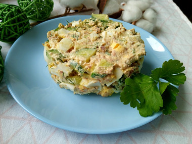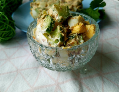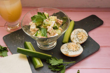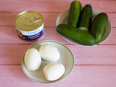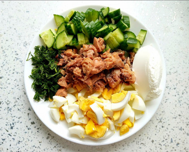 Хотелось приготовить максимально быстро и вкусно, что бы ужин был еще и полезный. Взяла баночку консервированного тунца, я брала в масле, поэтому решила в салат не добавлять майонез. Два не больших огурчика нарезала кубиками и три вареных яйца. Добавила немного зелени и все перемешала, немного подсолила, ведь тунец тоже слегка соленый. Салат получился очень вкусным и ароматным, а за счет тунца еще и сытным.