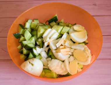 Как сварить яйца вкрутую? Положите их в холодную воду, поставьте варить на небольшой огонь. Варите яйца 9 минут после закипания, затем залейте холодной водой и остудите. От резкого перепада температур скорлупа лучше очистится. Очистите их. Порежьте яйца небольшими кубиками.