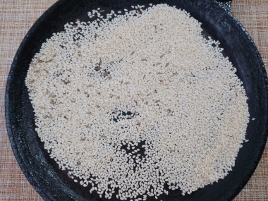На сухую сковороду насыпьте кунжут и семена зиры. Слегка поджарьте их на маленьком огне до легкого золотистого оттенка. Важно не пережарить кунжут, иначе он может начать горчить.
