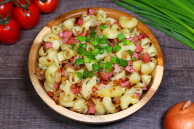 Макароны с колбасой на сковороде готовить совсем не трудно, получилось вкусное и сытное блюдо. Вместо зеленого лука посыпала сверху мелко порубленной зеленью петрушки. Получилось к тому же свежо и ароматно!