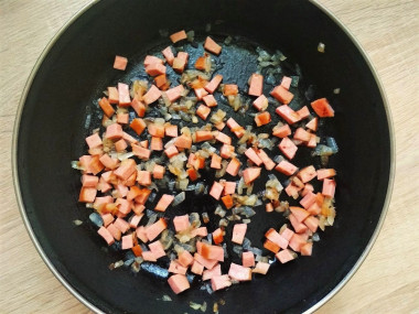 Налейте немного растительного масла на сковороду и выложите туда нарезанную колбасу. Обжарьте её до лёгкого румяного цвета. Затем добавьте в сковороду нарезанный лук, перемешайте и продолжайте жарить ещё несколько минут. О том, как подобрать идеальную сковороду, а также как правильно выбрать растительное масло, читайте в отдельных статьях, ссылки в конце рецепта.