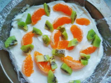 Мандарины вымыть и очистить, разобрать на дольки. Десерт получится более нежным, если дольки очистить от всех плёночек. Бывает попадают мандарины с совсем тонкой плёнкой, в таких её можно оставить, если более грубая и толстая, всё же лучше удалить. Дольки можно оставить целыми или нарезать, так они равномернее распределятся в десерте. Это самая трудоёмкая работа в рецепте, которую можно сделать заранее, накрыть очищенные мандарины и убрать в холодильник.