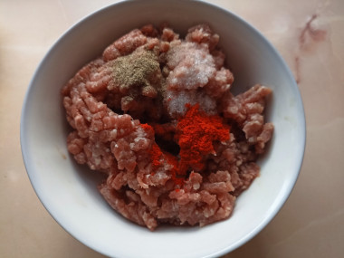 Как сделать кабачки кольцами с фаршем в духовке? Начните приготовление с фарша. Как сделать фарш? Говядину помойте и освободите от плёнок, если таковые имеются. Разрежьте на небольшие кусочки и пропустите через мясорубку с решеткой с мелкими отверстиями. Я рекомендую прокрутить мясо два раза. Тогда фарш получится более нежным. Фарш посолите и поперчите по вкусу. Добавьте любимые специи. У меня это сушёный чеснок и копчёная паприка.