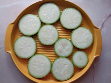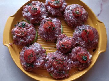 Кабачок помойте и нарежьте кольцами. Если кабачок с толстой кожей, то снимите ее овощечисткой. Выложите кольца кабачка на смазанный растительным маслом противень. Сверху распределите говяжий фарш с горкой. Я не солю кабачок, но это можно сделать, если вы хотите придать блюду более яркий вкус. Включите духовку разогреваться до 200 градусов.
