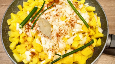 Добавьте в сковороду лавровый лист и тушите картофель на медленном огне в течение получаса под закрытой крышкой. Если будет необходимость, можете добавлять немного холодной воды в процессе приготовления, чтобы картофель именно тушился, а не жарился. По той же причине картофель необходимо периодически перемешивать.