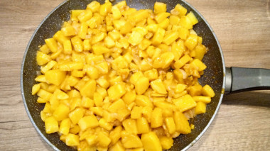 Добавьте в сковороду полстакана воды комнатной температуры и тщательно перемешайте будущее блюдо. Советую использовать бутилированную или фильтрованную воду.