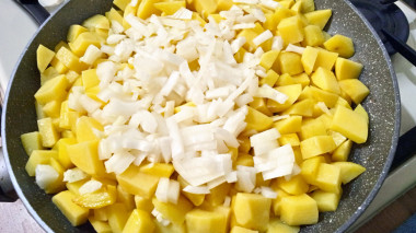Лук очистите от шелухи и мелко нашинкуйте. Переложите нарезанный лук в сковороду к картофелю. Если лук тяжело чистится от шелухи, можете на несколько минут положить его в тёплую воду.