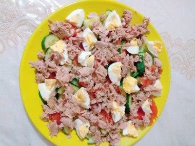 Яйца почистите от скорлупы и нарежьте на четвертинки. Выложите поверх салата. Разложите сверху кусочки тунца. Полейте салат остатками заправки. Подавайте сразу к столу. Приятного аппетита!