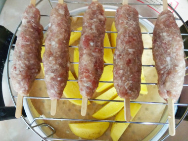 Сформируйте люля кебаб на небольших шампурах или деревянных шпажках. Чтобы из фарша удобнее было делать продолговатые колбаски, смочите руки холодной водой.