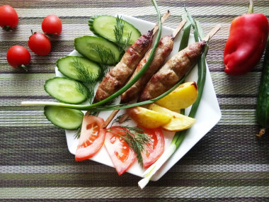 Приготовила люля кебаб на шампурах из свинины в духовке. У меня был готовый свиной фарш, добавила к нему измельчённый лук, соль, перец и паприку. Дала фаршу немного постоять в холодильнике. Сформировала из фарша колбаски на деревянных палочках. Жарила люля кебаб в аэрогриле, (на нижней решетке одновременно запекала картофельные ломтики), подавала со свежими овощами. Вкусно, просто, аппетитно! Спасибо автору за рецепт!