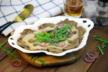 На тарелку выложите кусочки ростбифа, а сверху полейте соусом тонато. Украсьте блюдо каперсами и подавайте к столу. Приятного аппетита!