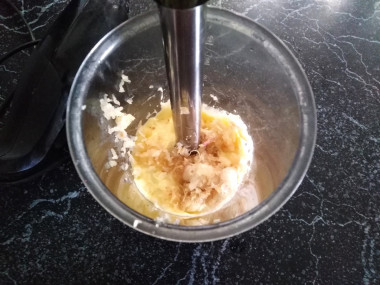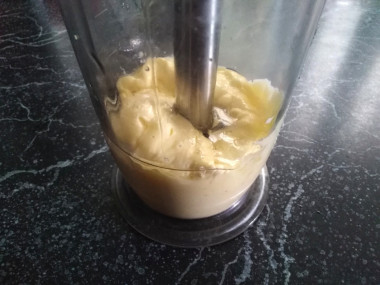 Держа погружной блендер на дне чаши, взбивайте до момента, когда почти вся масса станет белого цвета.