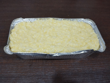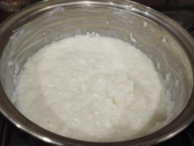 У меня был предварительно отваренный до полуготовности рис. Залила рис молоком и сварила молочную кашу и оставила остывать.