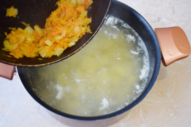 Сделайте зажарку, измельченные лук и морковь обжарьте на сковороде с растительным маслом до золотистой корочки.