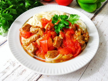 Мясо получилось нежным и сочным, пропиталось соком вкусных овощей, приобрело замечательный вкус и аромат. Ели его со спагетти.
