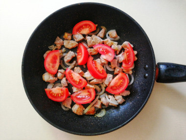 Свинина у меня была мягкая (карбонад), обжаривала ее, помешивая, пока мясо не зарумянилось. Добавив в сковороду лук, жарила его вместе с мясом. Это заняло у меня несколько минут, лук за это время стал мягким и прозрачным. Вслед за луком положила помидоры, посолила всё, поперчила, тушила мясо с овощами на сковородке под крышкой 20 минут.