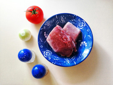 Как сделать свинину с луком и помидорами на сковороде? Подготовьте необходимые ингредиенты. Мякоть свинины нарежьте продолговатыми тонкими кусочками.