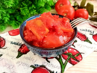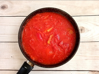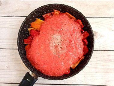 Перец у меня был обычный огородный, взяла три штуки и крупно нарезала. При обжаривании перчик аппетитно пахнет. Помидоры измельчила в пюре при помощи блендера. Попадались кусочки шкурки, но нам это не мешало. Можно, конечно, предварительно снять шкурку. Сразу посолила и добавила свежемолотую смесь перцев. Тушила минут 15 под крышкой до мягкости перца, но так, чтобы он не разварился.