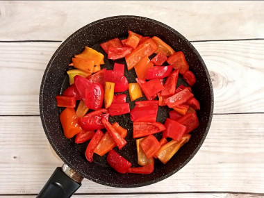 На сковородке разогрейте растительное масло, выложите нарезанный болгарский перец. Помешивая лопаткой, обжарьте перец на среднем огне 3-4 минуты.