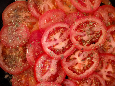 Помидоры промойте, нарежьте кружочками толщиной около 5-6 мм. Выложите их равномерным слоем на обжаренные лук и чеснок. Добавьте соль и перец по вкусу. Накройте сковородку крышкой и томите на слабом огне около 10 минут. Помидоры должны размягчиться. Огонь должен быть достаточно сильным, чтобы помидоры хорошо протушились, но и таким, чтобы не подгорели лук и чеснок. Если сока выделится слишком много, то излишки можно выпарить.
