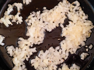 Репчатый лук почистите и нарежьте мелкими кубиками. Зубок чеснока также почистите и мелко нарежьте. На сковородке разогрейте растительное масло, выложите измельченные лук и чеснок. Обжаривайте на среднем огне периодически помешивая до полупрозрачности.