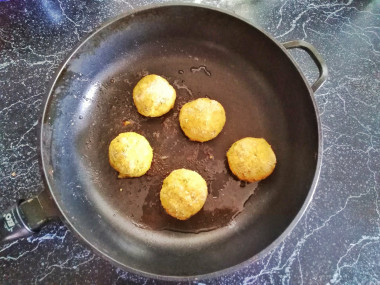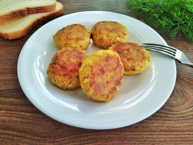 Из получившейся массы сформируйте небольшие котлеты и обваляйте их в панировочных сухарях. На горячую сковороду налейте немного растительного масла и выложите котлеты. Обжаривайте их на среднем огне пару минут, до золотистого цвета.