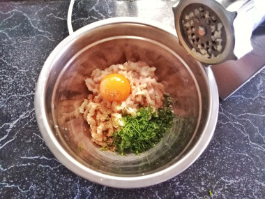 Добавьте в получившийся фарш яйцо и измельченную зелень. По вкусу немного подсолите фарш и посыпьте сухими специями по вкусу (я взяла молотый перец и паприку). Мясную массу очень хорошо перемешайте руками. Немного отбейте фарш о дно чаши, чтобы котлеты получились более плотные.